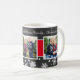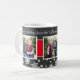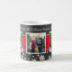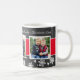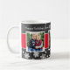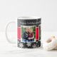 Une tasse festive de style tableau noir pour photo de Noël avec « Joyeuses Fêtes » en écriture blanche sur une bannière de tableau noir au charbon, avec de multiples photos personnalisées séparées par des panneaux d'accent rouge audacieux et encadrées par une bordure fantaisiste de flocons de neige et d'étoiles le long du bas. Le design comprend un nom de famille personnalisé et une année pour un vœu de vacances personnalisé. Tous les textes et photos sont entièrement personnalisables — un merveilleux souvenir de vacances pour les grands-parents, un cadeau de Noël en famille, ou une tradition annuelle à mettre à jour avec de nouvelles photos chaque année.