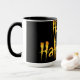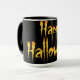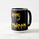 Cool à l'air orange et jaune Joyeux texte Halloween sur un arrière - plan noir. Tasse à café amusante et décorative pour célébrer la fête.