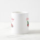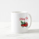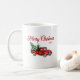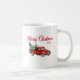 Une tasse à café de vacances avec script de calligraphie moderne "Joyeux Noël" (ou autre texte désiré) et votre année ou date personnalisée, avec un camion rouge de style classique chargé d'arbres de Noël.