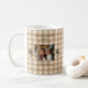 Ce charmant et cosy tasse donnera un message spécial à une maman spéciale. Les mots "Joyeux Noël, maman. Nous vous aimons !" apparaît dans la typographie décontractée sur en vichy brun rustique, juste au-dessus d'un modèle pour une photo spéciale. Sous la photo, il y a un modèle pour les noms de votre famille. Les arbres de Noël à feuillage persistant apportent une touche festive.
