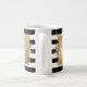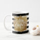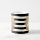 Joyeux Noël en lettrage chic blanc sur un éclaboussement d'or sur fond de rayures noires et blanches et de points dorés, cette tasse à café est amusante à ajouter à votre décoration de vacances ou à offrir en cadeau. PLUS de modèles dans notre collection.