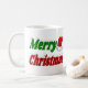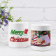 Mug avec Joyeux Noël en texte 3D et un chapeau de Père Noël. Customisez-le avec votre propre photo. Mug disponible en plusieurs styles et couleurs. Un grand cadeau de Noël pour siroter des boissons chaudes les nuits froides pendant les vacances.