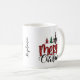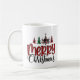Cette tasse à café festive présente une image textuelle "Joyeux Noël" avec des arbres de Noël dans le design sublimé et personnalisée avec votre nom le long du côté. Parfait pour cette tasse de café matinal de vacances.