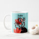 Un mignon monstre personnalisé tasse avec une créature de dessin animé noire avec quatre yeux sur de longues tiges rayées en noir et blanc souriant, cachée dans des tulipes rouges abstraites. Ce joli design girly a du texte personnalisable.
