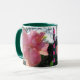 Le soleil de matin jette un coup d'oeil au-dessus du dessus de montagne en Hawaï et allume cette fleur de ketmie. Le mot hawaïen "Aloha" au centre de la tasse peut être supprimé si désiré.
