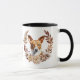 Une jolie couronne d'automne dans les tons marron, brun, brun et crème entoure l'aquarelle d'un chien Basenji brun et blanc. L'image est imprimée deux fois sur la tasse, avec votre texte personnalisé entre eux.