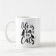 Cette mignonne tasse de citation est parfaite pour tous ceux qui aiment les chats! Rendre l'amoureux des chats heureux dans votre vie avec un cadeau de cette drôle de tasse avec le dicton "la vie est meilleure avec les chats" en typographie en lettres noires avec deux illustrations de silhouette de chat.