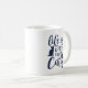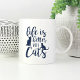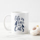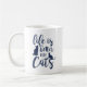 Cette mignonne tasse de citation est parfaite pour tous ceux qui aiment les chats! Faites plaisir à l'amoureux des chats dans votre vie avec un cadeau de cette drôle de tasse avec le dicton "la vie est meilleure avec les chats" en bleu marine typographie lettrée avec deux illustrations de silhouette de chat.