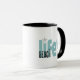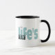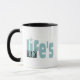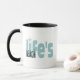 Life's A Beach Coffee Mug. Noir et bleu de plage avec étoiles de mer. Design de l'Emporium de Jenn.