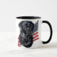 Une tête noire de labrador retriever devant un drapeau américain de ondulation.