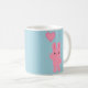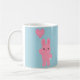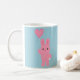 Un lapin doux, rose, de kawaii de style, avec un visage potelé, des bras et des jambes, tient un ballon en forme de coeur rose sur un arrière - plan bleu-clair de point de polka.