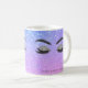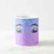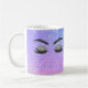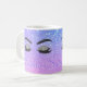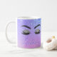 Lashes de glamour girly moderne et sourciller tasse à café salon avec de beaux yeux de maquillage et des sourcils au-dessus d'un mauve violet dégradé holographique, et lavande lilas parties scintillant arrière - plan pétillant. ++++++++++++++++++++++ Personnalisez-le avec le nom du salon de technicien et de pastel violet.
