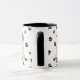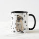 Un adorable chien de Carlin vous regarde de deux côtés de cette tasse. Le texte entre les deux images dit "Le 8ème jour, Dieu a créé le CARLIN et l'a appelé TRÈS BIEN". Les images de chien et la bannière blanche ovale contenant les champs de texte sont placées sur un arrière - plan blanc avec des empreintes de pattes noirs. Mignonne !