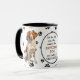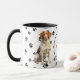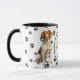 Un beau chien breton est assis sur les deux côtés de cette tasse. Le texte entre les deux images dit "Le 8ème jour, Dieu a créé le CHIEN BRITANNIQUE et l'a appelé TRÈS BIEN". Les images de chien et la bannière blanche ovale contenant les champs de texte sont placées sur un arrière - plan blanc avec des empreintes de pattes noirs.