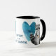 Un adorable petit raton laveur tient une tasse à café avec un coeur bleu derrière lui. L'image est sur deux côtés de la tasse, avec le texte entre les images qui dit "Le CAFÉ est mon ANIMAL SPIRIT". Mignonne !