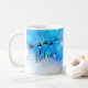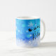 Tasse de Noël avec une silhouette noire de Père Noël dans son traîneau tiré par son renne volant à travers le ciel. Croyez écrit dans une police de script tendance. L'arrière - plan est un modèle de flocon de neige glacé bleu glacé.