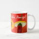Encore la vie de trois piments rouges portant des sombrers en citron et mandarine contre l'arrière - plan texturé de la journée mexicaine chaude et ensoleillée. Tasse au café. Drôle thème d'amitié. Vous pouvez changer le texte modèle Hola, Amigo !