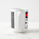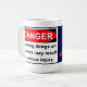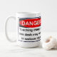DANGER ! Les choses émouvantes sur ce bureau peuvent avoir comme conséquence la blessure sérieuse. Tasse drôle. Un côté a un panneau d'avertissement, l'autre côté fait décrire un corps dans la craie touchant "l'agrafeuse rouge" légendaire du savoir de bureau. Les gradients de couleur d'arrière - plan d'un bleu-foncé, au noir de scène du crime de trottoir.