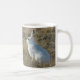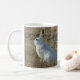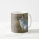 Tasse avec légende Lièvre d'Amérique. Parfois, même les plans de la mère nature peuvent être contrariés par le temps, ce lièvre d'Amérique a changé pour sa robe blanche d'hiver, mais les neiges d'hiver sont en retard et au lieu d'être camouflé, il se démarque maintenant contre les herbes brunes de la prairie.