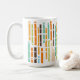 Cette tasse a un design moderne du milieu du siècle de lignes verticales dans les années 1970 orange, marron, vert et bleu sur un terrain de blanc avec des lignes horizontales blanches les traversant.