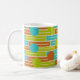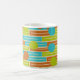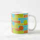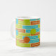 Cette tasse a un design moderne du milieu du siècle de rectangles extensibles en vert citron, marron cannelle et turquoise avec des cercles superposés.