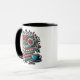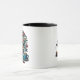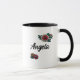 Tasse à café personnalisée avec livres anciens, fleurs vintages et une pile de livres nostalgiques à côté d'une tasse à café chaude. Couleurs bordeaux, bleu, rouge et blanc cassé.
