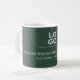 Cette tasse à café d'entreprise personnalisée comprend un exemple de logo placé en haut que vous pouvez remplacer par votre propre logo d'entreprise ou d'entreprise personnalisé. La dénomination sociale est imprimée sous le logo, suivie de l'emplacement. L'arrière - plan est de couleur vert pinède. Il fait un grand cadeau pour les clients ou les employés.