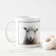 Tasse à café avec modèles pour logo et texte. Fabriqué sur le thème du tricot et de la boutique de fils, le visage d’un mouton mignon tient la place pour un logo (ou utiliser l’image). À côté de l’image se trouve le texte imprimé en gras pour un nom de magasin, le nom du concepteur, le site Web ou tout autre texte publicitaire. Créez pour les clients, ou pour quelqu'un que vous connaissez qui gère une entreprise liée au tricot.
