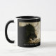 Un profil d'un loup noir solitaire passant devant un mur couleur crème de pierre qui a un noeud celtique et un dragon celtique sculpté dans le mur