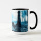 Loup noir debout seul dans l'ombre d'une forêt sombre. La scène naturelle est rétro éclairée par un soleil éclatant rayonnant de bleu glacé à travers les arbres.