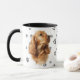 This mug for the Cocker Spaniel owner features a beautiful portrait of a buff colored Cocker. The image is printed twice, and between them is an oval with the black text that says "Love my Cocker Spaniel". The oval and dog images are placed on a white background sprinkled with paw prints. Your monogram or name can be placed in a text field at the bottom.