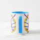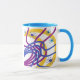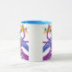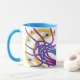 Cette tasse comporte un motif complexe fleuri aux nuances du bleu, du magenta et de l'or. Des objets élémentaires abstraits sont dispersés partout : les soleils, lunes et trajectoires de courber.