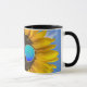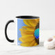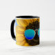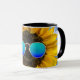 Près d'un tournesol jaune portant des lunettes de soleil rétro avec un arrière - plan du ciel d'été.