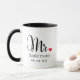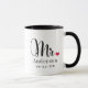 Les tasses à café personnalisées pour M. et Mme nouvellement mariés sont dotées d'un élégant script noir et d'un nom de famille et d'un monogramme de date de mariage personnalisés. Le design comprend un joli détail de coeur rouge. Fait un grand cadeau mariage ! Magasinez notre magasin pour la conception de la tasse de coordination.