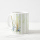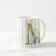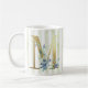 Lettre M, initiale dorée avec aquarelle bleue feuillage sur bande bleue et blanche première mug. © Julie McIver