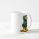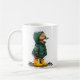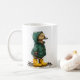 Tasse à café avec canard mignon en bottes de gomme et imperméable jouer dans la flaque