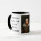 Tasse/tasse de café avec une citation de la "Douzième nuit" de William Shakespeare : "Il n'y a pas d'obscurité mais d'ignorance." Blanc avec intérieur noir et poignée et un portrait de Cobbe, dit être un tableau d'un jeune Shakespeare.