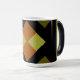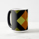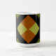 Design audacieux avec un diamant vert et brun au milieu et triangles vert violet et orange au dessus et au fond.