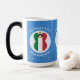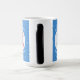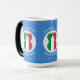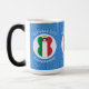 La tasse à morphing magique présente un Ange Drapeau Italien, habillé dans le drapeau de l'Italie, à l'intérieur d'un cercle fractal blanc de carrés grossiers. Le cercle est sur un arrière - plan fractal bleu de carrés grossiers. Ajoutez un nom, un jour férié et une année pour personnaliser votre tasse en cadeau ou pour ajouter à votre décoration de vacances. Jolie décoration Hanoukka. Le design se déroule sur trois côtés de la tasse.