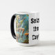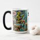 Une tasse qui se transforme et dévoile une fille cyberpunk sur un champignon qui se réchauffe, avec "Saisir la journée" en caractères gras et électriques. C'est une dose quotidienne de motivation futuriste !