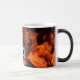 Une tasse qui ressemble à une tasse noire classique jusqu'à ce qu'elle soit chauffée ; puis on y découvre une tasse enveloppée de flamme, dont le nom de l’auteur Hunter Holmes, ©️ logo et lien.