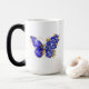 Jewelry, blue, sapphire, sparkling flower butterfly with wing decorated with blue, precious flowers with gold leaves on white background.