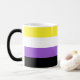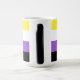 Les personnes non binaires peuvent s'identifier comme ayant au moins deux sexes; sans sexe; le passage d'un sexe à l'autre ou la fluctuation de l'identité de genre; ou être un troisième sexe ou un autre sexe, une catégorie qui comprend ceux qui ne portent pas de nom à leur sexe. Chaque couleur de bande représente différents types d'identités non binaires: Jaune pour les personnes qui s'identifient en dehors du binaire de genre, blanc pour les personnes non binaires avec des sexes multiples, violet pour celles avec un mélange de sexe masculin et féminin, et noir pour les personnes de sexe masculin.