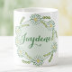 Daisy color morphing mug in pastel green and yellow, on a dotted background. Customize the name area.