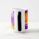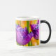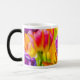 Violet coloré, violet, tulipes roses sur un lit à fleurs. Presque toutes les couleurs arc-en-ciel présentes. Scène florale lumineuse et positive. Photographie macro. Tasse à café pour n'importe qui.