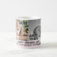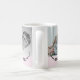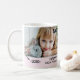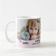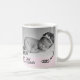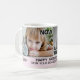 Cute et belle tasse à café en fête des pères avec deux photos personnalisables de votre fille, une couleur réelle d'un côté, et une noire et blanche de nouveau-né de l'autre côté (effet noir et blanc est automatiquement appliqué). Sous les images, le texto personnalisable en polices gris foncé lit Happy fête des pères de votre plus grand fan, avec le nom de l'enfant, l'année en cours, et son année de naissance sur un arrière - plan rose clair.