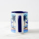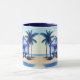 Une tasse à café dans une charmante maison de plage avec véranda est nichée entre deux grands palmiers, face à un océan serein sous un ciel clair et lumineux.