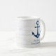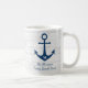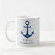 Savourez votre café dans cet ensemble sur le thème nautique doté d'une ancre bleu marine. Le design a un arrière - plan patiné en bois blanc. Mug peut être personnalisé avec un monogramme et un nom ou une phrase.