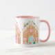 Cette mignonne tasse à café maison en pain d'épice est tout décorée pour Noël avec un toit de grenouille et des détails de glaçage blanc et de bonbons! Il y a trois maisons en pain d'épices autour de la tasse. Les couleurs sont rose, aqua, marron et blanc.