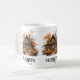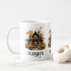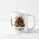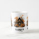 Une tasse avec un cool et l'illustration éffrayante d'une maison hantée en bois. Entouré de grands citrouilles oranges et d'arbres aux feuilles oranges. Les fenêtres oranges ajoutent une belle lueur. Amusant design Halloween.